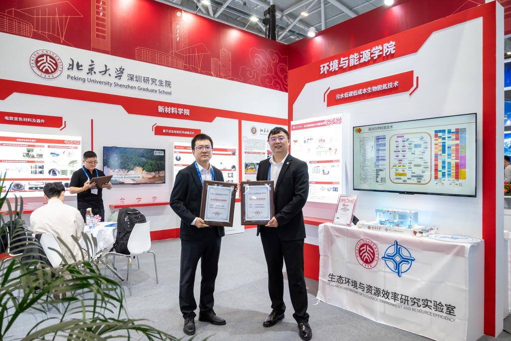 2025年11月14日至16日,第二十七届中国国际高新技术成果交易会在深圳成功举办。北京大学深圳研究生院环境与能源学院生态环境与资源效率研究实验室自主研发的两项创新技术——“基于稳定化硫化亚铁纳米颗粒的土壤和地下水原位修复技术与设备”与“污水低碳低成本生物脱氮技术”,从参展成果中脱颖而出,荣获"优秀科研成果创新奖"。
