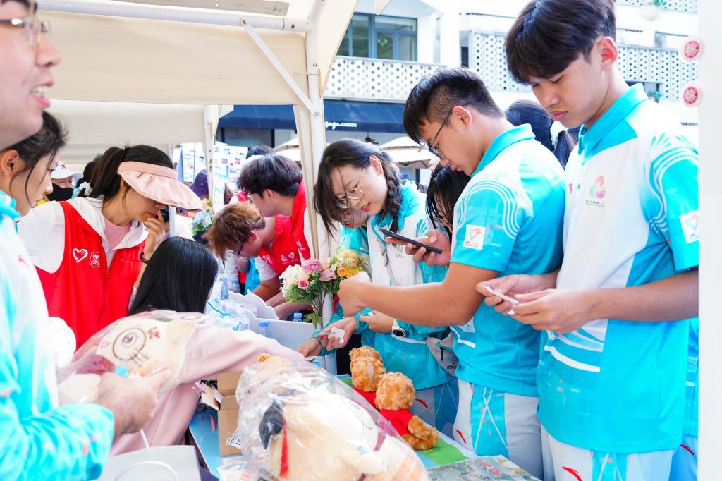 北大深研院展位前始终人气不减。为向志愿者在十五运会期间的辛勤付出表示感谢,协会为同学们准备了北大团小喵、小熊、笔记本、燕园纸袋、明信片等丰厚纪念品。大家笑容洋溢,并纷纷合影留念。