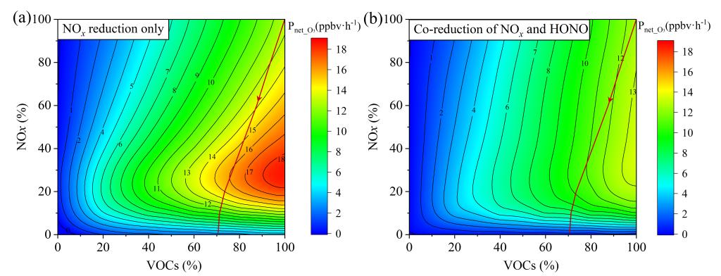 本研究基于观测数据结合机器学习与光化学模型开展分析。首先利用机器学习建立真实大气中HONO与NOx的协同变化关系,并将其嵌入OBM-MCM模型,以定量评估不同NOx和VOCs削减情景下HONO对臭氧生成敏感性的调节作用。通过约束与非约束HONO情景对比,计算臭氧净生成速率和相对增量反应性,结合改进的经验动力学建模方法(EKMA)绘制臭氧敏感性等值线图,从而揭示HONO变化对NOx减排引起的臭氧响应的抵消效应。