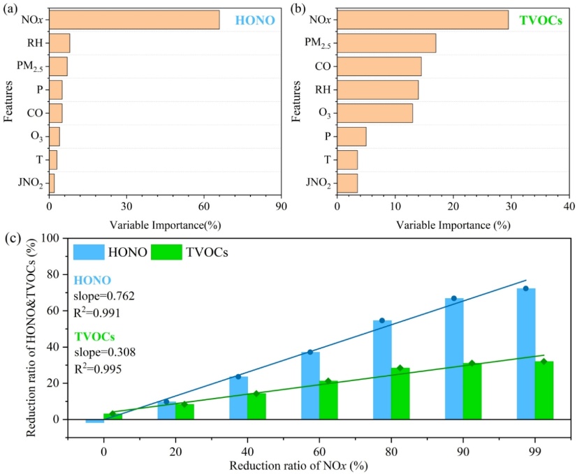 相较于未考虑HONO的传统模拟,引入观测约束的HONO后,白天臭氧净生成速率提高了95%,这是由于HONO光解增强了OH自由基的生成,加速了VOCs氧化以及HO2/RO2+NO反应途径。HONO的相对增量反应性(RIR)与NOx呈显著负相关(R2= 0.86),表明NOx导致的O3升高越明显,HONO引起的O3降低效应也越强。机器学习结果进一步预测,在大气中NOx削减10%时,HONO和总VOCs浓度将分别同步下降约7.6%和3%。这一变化使得通过EKMA得到的臭氧净生成速率由原本最高升高28%,转变为下降14%,从而表明HONO的降低可以抵消NOx减排所引发的O3升高效应。
