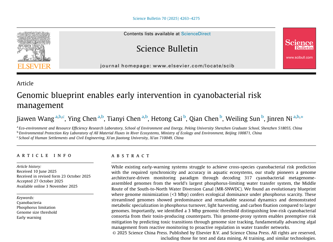 该研究得到了国家自然科学基金联合基金重点支持项目(No. U2240205)和科技部重点专项项目(2021YFC3200900)的资助。研究成果以“Genomic blueprint enables early intervention in cyanobacterial risk management”为题,于近日发表于Science Bulletin。倪晋仁教授为论文通讯作者,北京大学深圳研究生院博士后王佳文为第一作者。