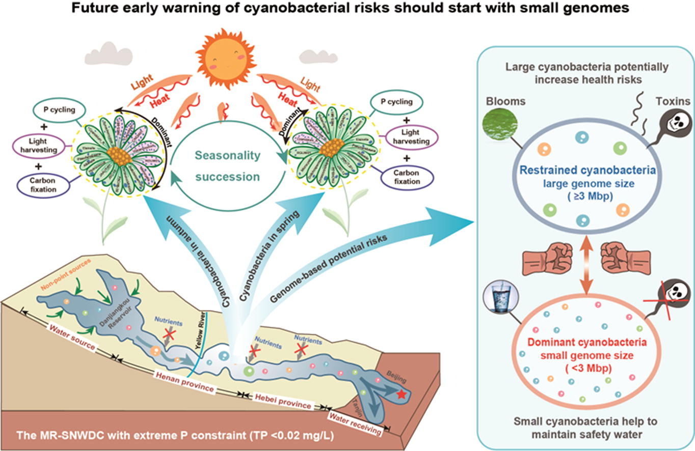 研究团队从南水北调中线工程——这个磷含量长期低于0.02 mg/L的大型调水系统中获取了宏基因组数据,重构出317个蓝藻基因组,发现了一个清晰的“基因大小-生态功能”分化规律:基因组小于3 Mbp(百万碱基对)的蓝藻为“精简型”:它们在贫磷环境中占优,擅长磷吸收、光能捕获和碳固定,几乎不产毒素,是系统中的“低风险工作者”;而基因组大于3 Mbp的属“复杂型”:它们携带毒素基因和浮力调控基因,在一定条件下可能引发藻华并释放微囊藻毒素等有害物质,属于“高风险群体”。不仅如此,这些小基因组蓝藻还呈现明显的季节性更替:春季以聚球藻为主,秋季则转变为蓝菌属占优,反映出在温度与光照驱动下的生态位分化。