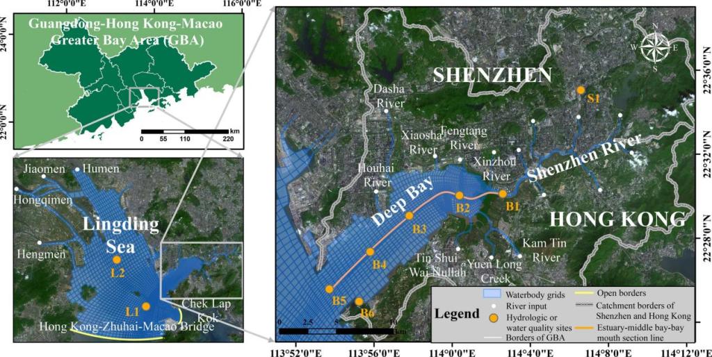 本研究以深圳河湾流域为研究对象,采用SWMM(Storm Water Management Model)和EFDC(Environmental Fluid Dynamics Code)的耦合模型,对2022年的海湾水质过程进行反演。