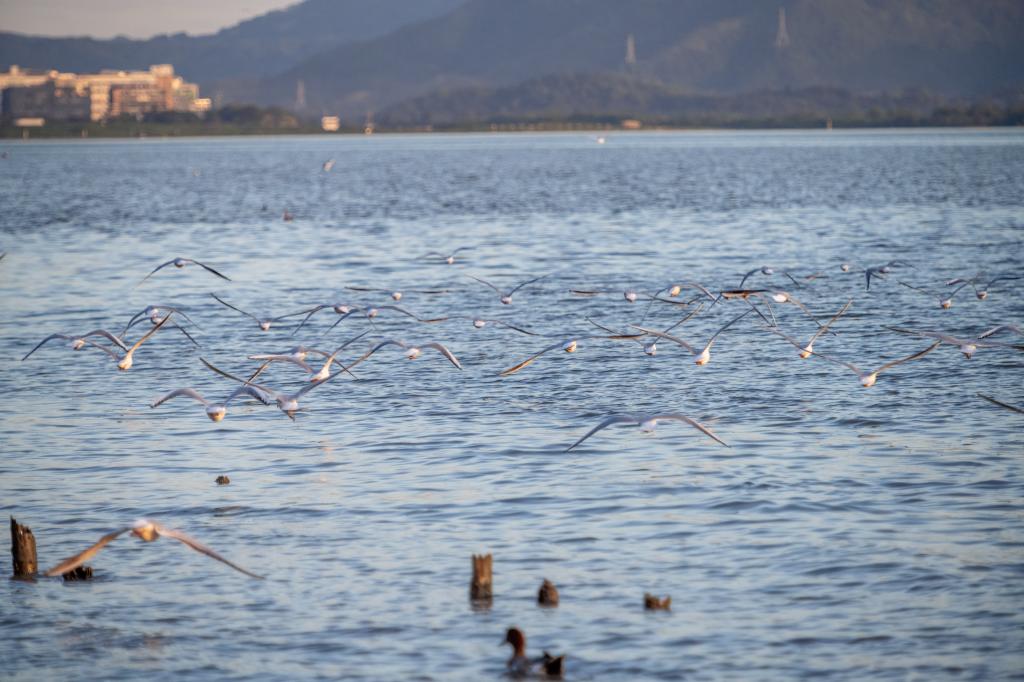 图片说明:夕阳下,候鸟在深圳湾寻觅食物和歇脚地。——林阳杰 摄