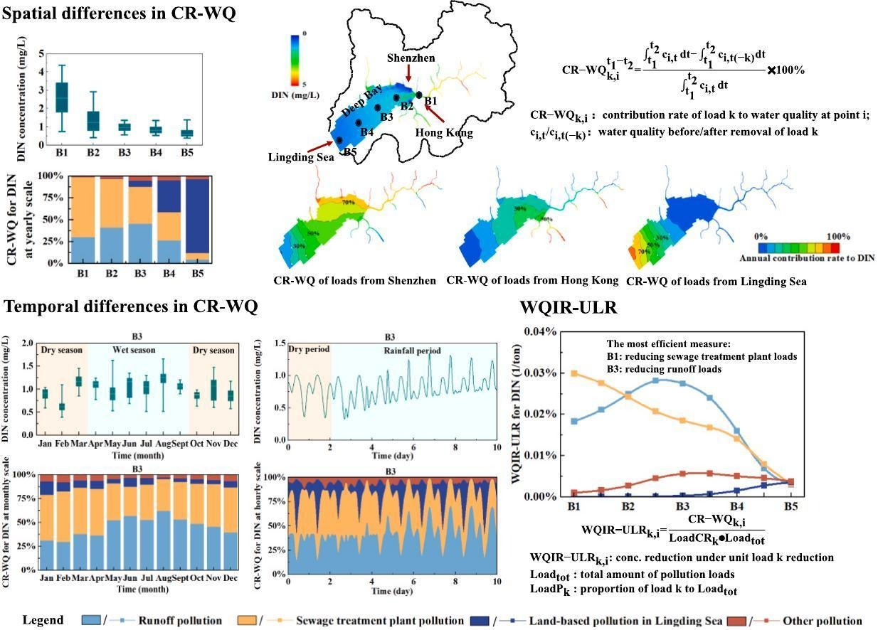 城市化海湾的水质受多种污染负荷的影响,导致其具有复杂的时空变异性,但很少将该差异进行量化并用于流域污染控制。本研究提出了一种分析各类污染负荷对水质贡献率时空变化的方法,污染负荷对水质的贡献率(CR-WQ),并给出了一项效率指标以指导流域污染控制。主要结果总结如下: