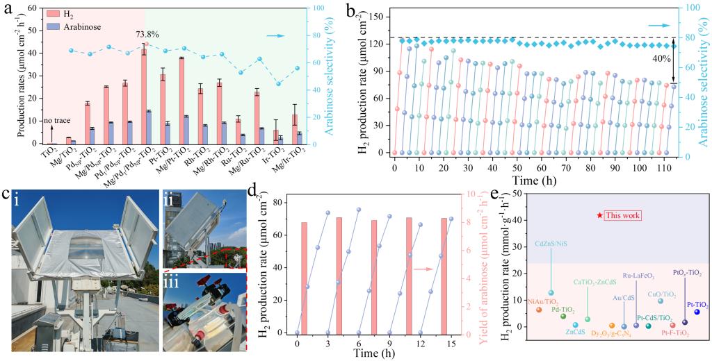 要点:(1) 双组分协同效应与性能优势,系统的性能对比实验证实,Mg/Pd1/PdNP-TiO2的产氢与阿拉伯糖生成性能远超单一组分对照样品,其中Pd单原子是催化反应的核心活性位点,氧化态Mg物种的引入实现了催化活性与产物选择性的进一步跃升。(2) 优异的反应选择性与碳平衡,反应在中性水溶液中进行,完全避免了强碱体系中葡萄糖过度裂解、聚合等副反应,10 h反应后体系碳平衡超97%,阿拉伯糖选择性稳定维持在80%左右,无明显过度氧化副产物生成。(3) 优异的长周期催化稳定性,催化剂在114 h的长周期测试中仍保持稳定的催化活性与产物选择性,反应后Pd、Mg含量无明显浸出,晶相、形貌与活性位点的化学状态均保持完好,展现出优异的结构与催化稳定性。(4) 规模化应用验证,户外聚光太阳能驱动体系中,催化剂在自然太阳光下实现了高效稳定的阿拉伯糖与氢气联产,证实了该技术的工业化应用潜力。