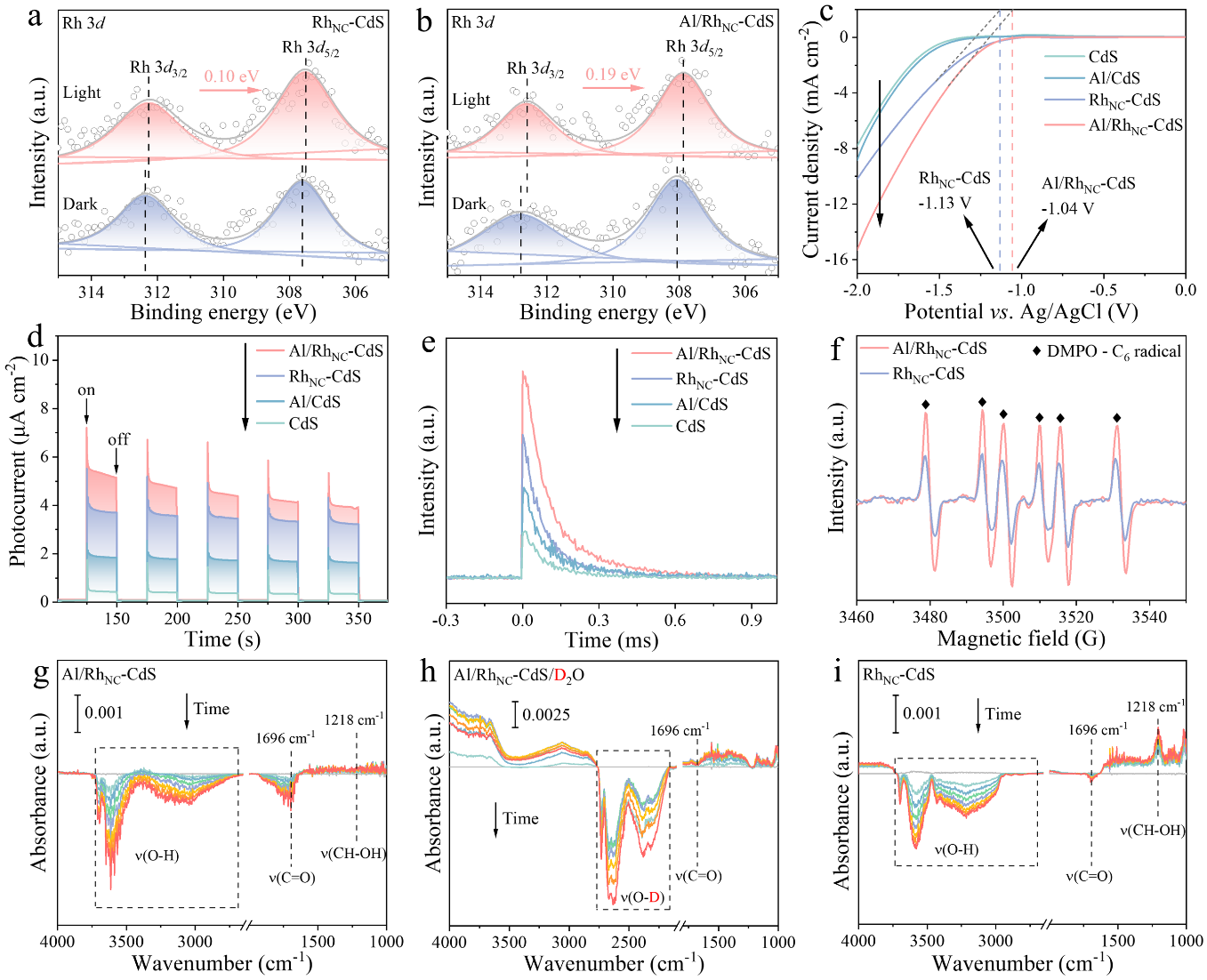 要点:(1) 原位XPS验证电荷定向转移,光照条件下,Al/RhNC-CdS中Rh 3d结合能发生显著负移,证实光生电子可从CdS高效转移至Rh纳米团簇,且体相压缩应变进一步提升了电子转移效率。(2) 光电化学与光谱表征证实载流子动力学优化,Al/RhNC-CdS展现出最高的瞬态光电流响应、最低的电荷转移电阻、最弱的稳态荧光发射与最慢的瞬态光电压衰减,证实双应变协同作用显著抑制了光生载流子复合,大幅提升了电荷分离与迁移效率。(3) 原位表征揭示反应路径,原位ESR测试捕获到碳中心自由基信号,证实HMF活化遵循α-C─H键直接空穴氧化路径;原位DRIFTS表征证实,表面拉伸应变促进了关键中间体*C6H5O3的快速转化,同时Rh纳米团簇可精准调控水分子解离过程,避免羟基物种过度占据活性位点。