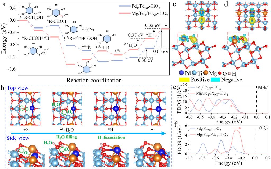 要点:(1) 理论计算揭示决速步能垒优化,DFT计算表明,葡萄糖光催化转化的决速步为水分子填充氧空位实现的表面晶格氧再生过程,Mg物种的修饰将该步骤的反应能垒从0.63 eV大幅降至0.37 eV,从根本上提升了催化反应的动力学速率。(2) 电子结构根源解析,电荷密度差分分析表明,Mg物种的引入可促进电荷定向转移,降低O-H键解离能垒;PDOS分析显示,Mg修饰使Pd 4d态发生负移,减弱了催化剂对阿拉伯糖产物的吸附,促进产物脱附;同时O 2p态发生正移,显著提升了晶格氧的氧化能力,促进葡萄糖分子的活化转化。(3) 反应路径阐明,葡萄糖分子通过α─H脱氢、侧链C─C键裂解、脱甲酸、加氢还原等步骤,高选择性生成阿拉伯糖,同时TiO2表面晶格氧的消耗与再生形成动态循环,保证了催化反应的持续稳定进行。