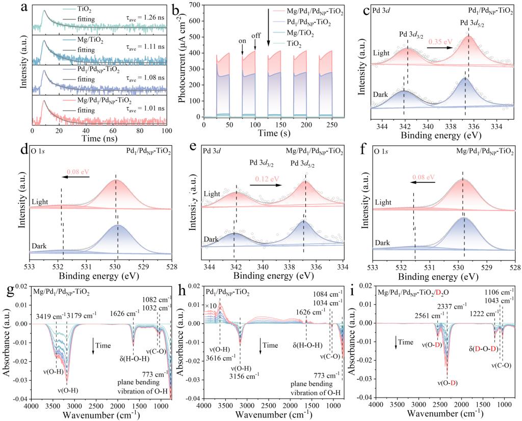 要点:(1) 载流子动力学显著优化,时间分辨荧光光谱显示Mg/Pd1/PdNP-TiO2具有最短的荧光寿命,证实光生载流子可被活性位点快速捕获;瞬态光电流与电化学阻抗测试表明,催化剂具有最高的光电流响应与最低的电荷转移电阻,证实Pd单原子与Mg物种的协同作用显著促进了光生载流子的定向分离与迁移,有效抑制了电子-空穴复合。(2) 原位XPS验证电荷定向转移,光照条件下,催化剂中Pd 3d结合能发生显著负移,O 1s结合能发生正移,证实光生电子从TiO2定向转移至Pd单原子位点,形成富电子的产氢中心,而光生空穴在TiO2晶格氧位点富集,形成缺电子的氧化活化中心。(3) 原位红外揭示反应路径,原位ATR-IR表征证实,催化剂表面的Pd与Mg位点可协同促进水分子O─H键的活化与解离,且反应中生成的羟基物种均来源于水溶剂;同时清晰观测到阿拉伯糖的特征吸收峰,直接证实了葡萄糖向阿拉伯糖的选择性转化路径。