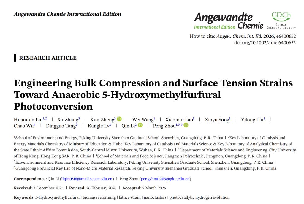 近日,北京大学深圳研究生院周鹏助理教授课题组在光催化生物质高值化转化与氢能联产领域连续取得重要研究进展,相关成果分别发表于国际顶级期刊《Angewandte Chemie International Edition》与《ACS Catalysis》。两项研究均围绕太阳能驱动生物质平台分子的绿色转化核心方向,分别从晶格应变工程、原子级氧化还原界面设计两个维度突破了现有催化体系的关键瓶颈,为高效光催化剂的设计与生物质资源的可持续利用提供了全新的理论指导与技术方案。