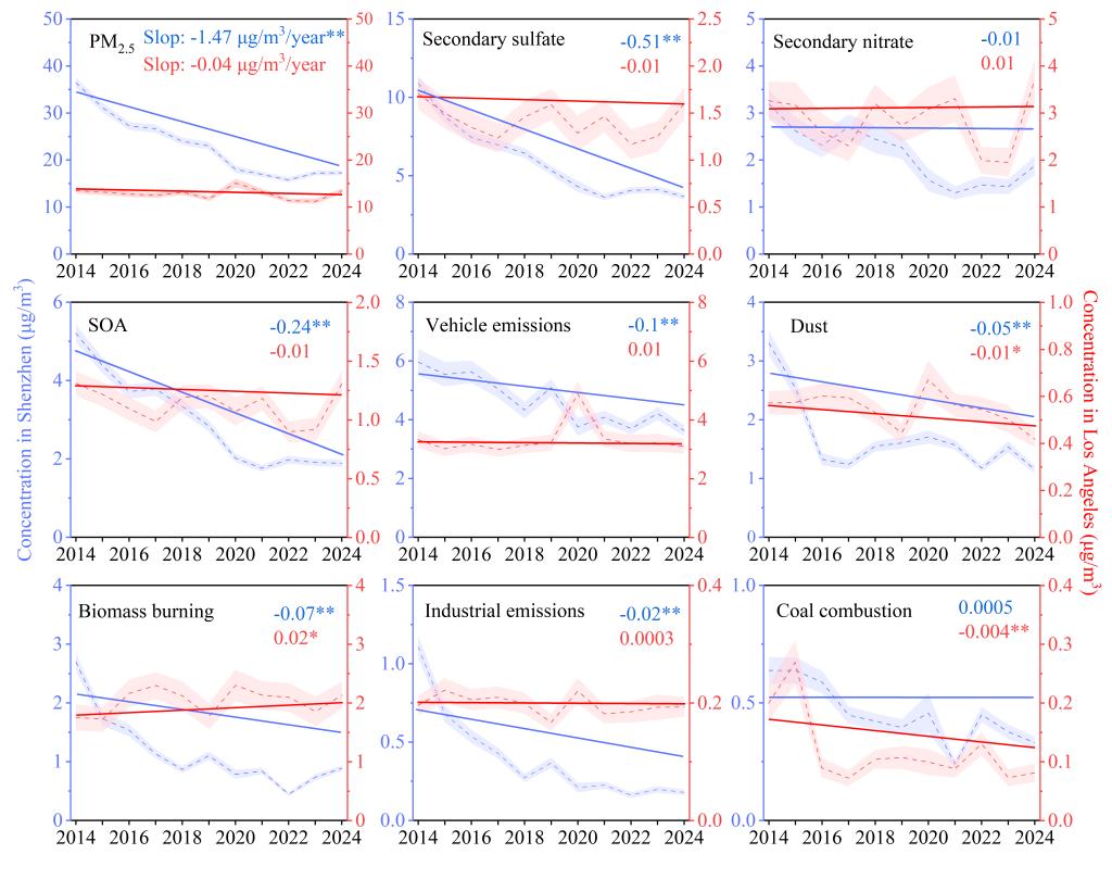 图2. 基于机器学习模型获得2014-2024年深圳和洛杉矶 PM2.5 来源解析结果