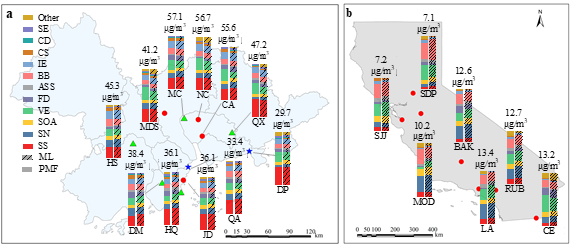 图1. 基于机器学习模型得出的珠三角和加利福尼亚州 PM2.5 来源解析结果.