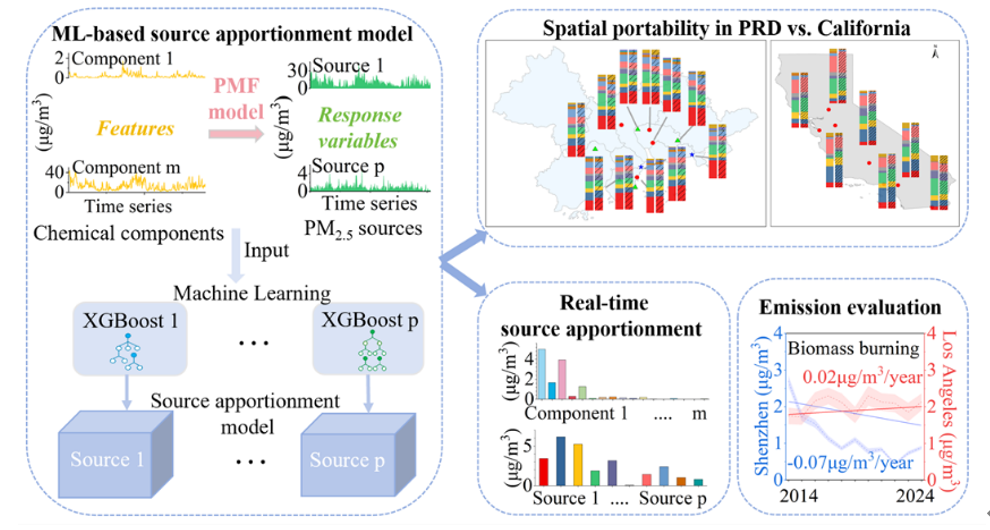 近日,北京大学深圳研究生院环境与能源学院大气研究团队在 Environmental Science & Technology 发表题为 Machine-Learning Source Apportionment of Particulate Pollution Aids Urban Emission Regulations 的研究论文。该研究提出了一种基于机器学习的PM2.5来源解析模型,利用多尺度气溶胶组分数据,实现对PM2.5来源的近实时追踪和较准确量化。基于中国珠江三角洲地区和美国加州地区近二十年的观测数据,研究表明,该模型能够高效复现传统受体模型的来源解析结果,识别出珠三角以二次硫酸盐和机动车排放为主、加州以机动车排放、二次硝酸盐和生物质燃烧为主的来源特征,并进一步揭示了深圳过去十年人为源得到有效控制因而PM2.5显著下降、美国洛杉矶PM2.5变化趋于平稳且受野火污染增强影响的不同演变趋势。论文提出的机器学习方案可以高效复刻基于受体模型的解析结果,可支持近实时污染来源分析,并为相关政策制定提供重要支撑。