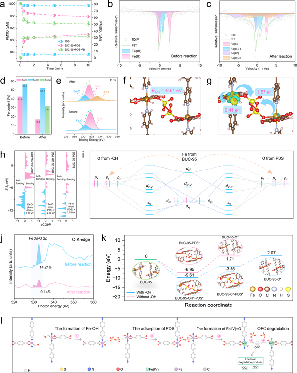在类芬顿体系中,催化位点与过氧化物之间的电子转移速率决定了催化降解速率。但除了电子作用外,催化位点的动态变化也会影响过氧化物的活化。在该研究中,作者合成出了一种具有同质互穿的新型铁基金属有机框架材料(命名为BUC-95,BUC为北京建筑大学的简称)。BUC-95所呈现的动态拉伸作用强化了过硫酸盐的活化,将铁位点吸附的-OH选择性生成了高价铁(FeIV=O)物种,实现对多种新污染物的强化降解。